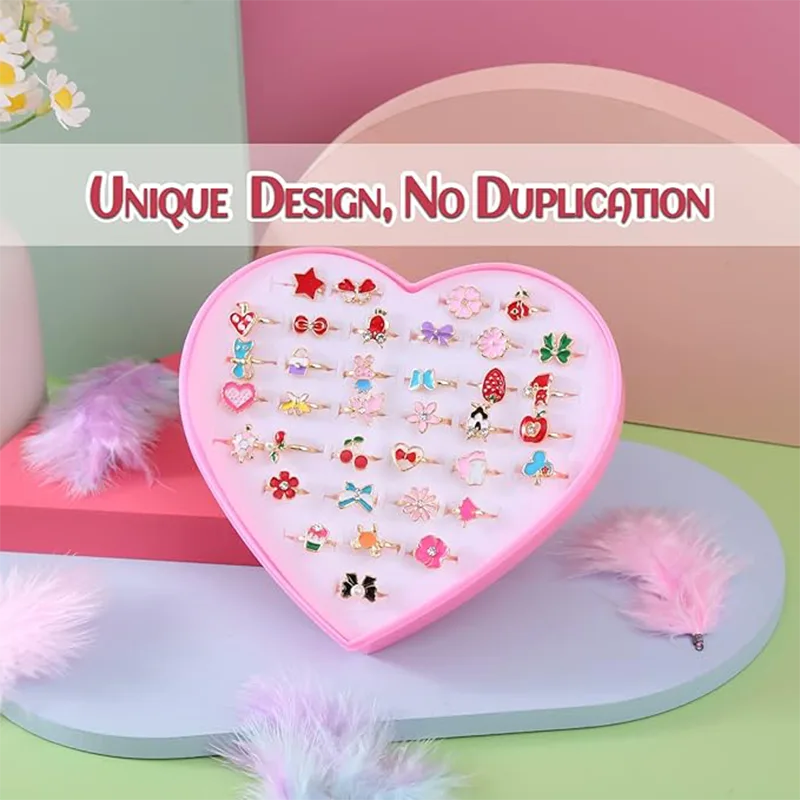 A doboz belsejében 36 aranyos lány ötvözet ékszergyűrű található. Ezek a gyűrűk mindegyike színes és aranyos, olyan mintákkal, mint például fehér nyulak, eper, virágok, baglyok, csillagok, teknősök, cicák, masniak, almák, cseresznyék, pillangók, gombák, egyszarvúak, lóhere stb. Kiváló ajándék szeretett hercegnőjének.
