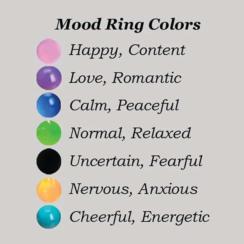 Minden gyűrűt egy speciális szív alakú dobozba helyeznek, amelyhez egy érzelmi gyűrűtáblázat is tartozik, hogy megértse az egyes színek jelentését, és készen áll ajándékba.