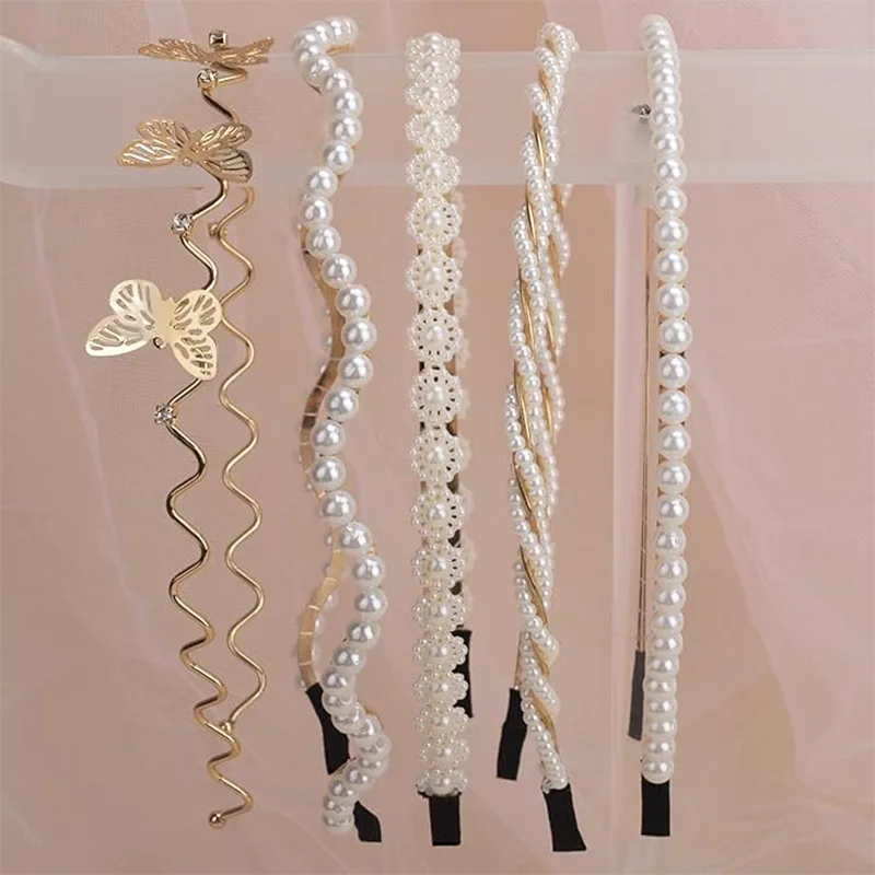 Ez a rugalmas gyöngygyöngyös fém fejpánt 10 különböző stílusban kapható, például gyöngy, fém, masni és fényes kristálygyöngyös fejpántok. Mindegyik stílus más-más igényt kielégít, és alkalmas a mindennapi viseletre.