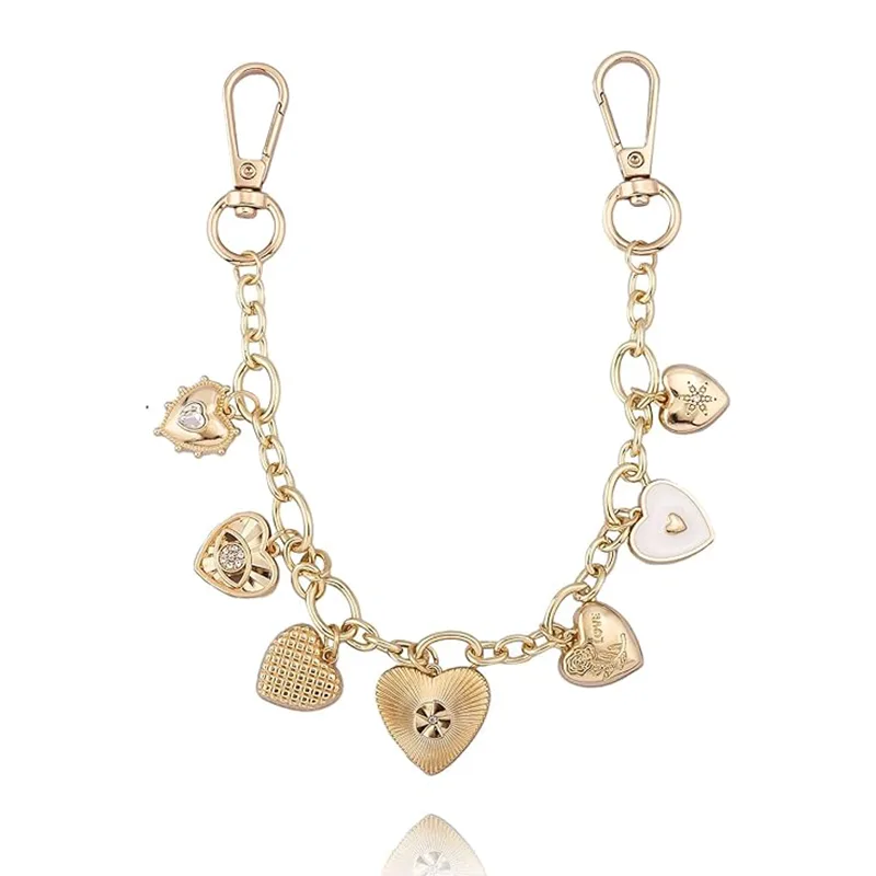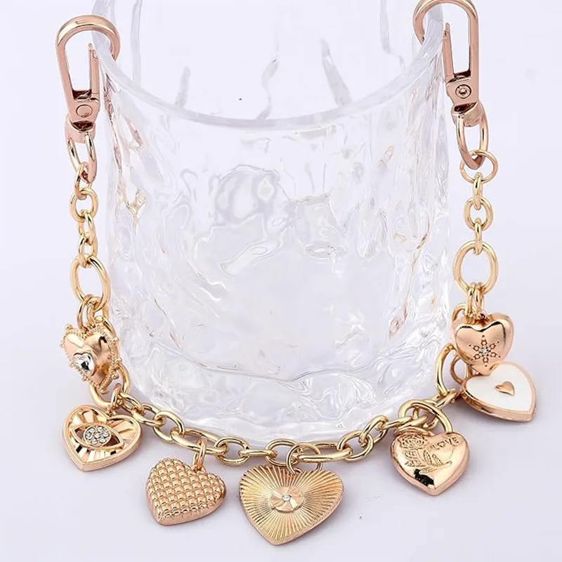 A YD JEWEL a cinkötvözetből készült kézitáskabáj gyártója és szállítója Kínában. 1 láncot és 7 egyedi, körülbelül 12 hüvelyk hosszú, szív alakú medált tartalmaz. Fémes szerkezetű, de könnyű és nem töri össze a zacskókat. Használható táskák, kulcsok és mobiltelefonok felakasztására. Divatos és aranyos, napi dekorációnak vagy fesztiválajándéknak is használható.